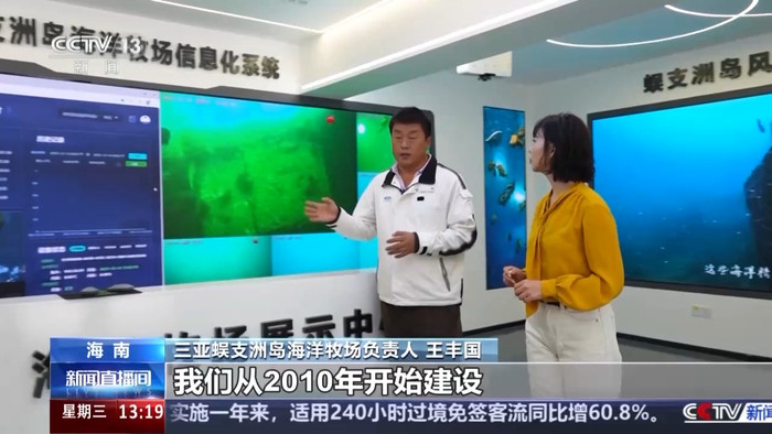 海南三亚蜈支洲岛海洋牧场负责人王丰国:目前我们所处的位置就是蜈支洲岛海洋牧场信息化展示平台。我们从2010年开始建设蜈支洲海洋牧场,珊瑚的覆盖率由15%左右提升到37.08%。看到一片荒漠慢慢被珊瑚覆盖,这种感觉一个字“爽”。